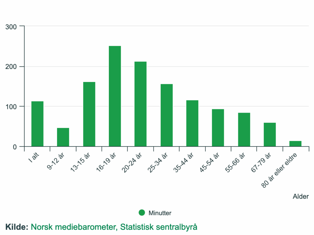 En av de tydeligste tendensene i SSBs tall er at de yngste aldersgruppene bruker klart mest tid på sosiale medier. Særlig ungdom og unge voksne skiller seg ut:
